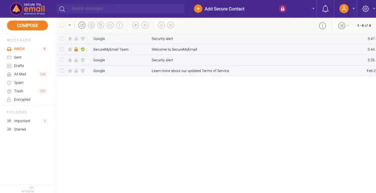 And here's the moment you've been waiting for – your SecureMyEmail inbox. It's pretty standard-fare and will be easily navigable for anyone who's used webmail before. Sending an encrypted email is likewise very similar.