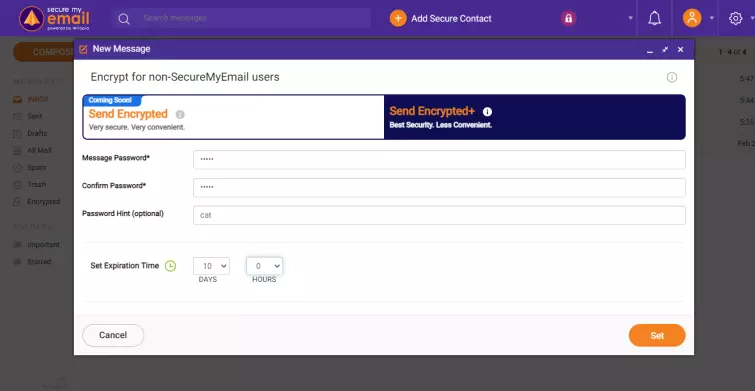 SecureMyEmail allows users to encrypt eight email addresses – you won't need to create a new email address, create a new account, or switch providers to reap the benefits of the service. Additionally, SecureMyEmail users can still send and receive emails from anybody. Any messages you send to non-users will still be encrypted end-to-end, and – as a nice bonus – you can set expiration dates on outgoing emails.