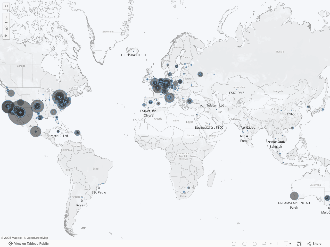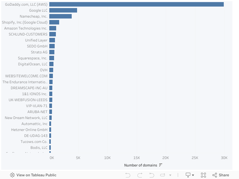 Throughout our analysis we noticed thousands of domains resolved to single IPs. This often occurs in shared hosting environments or when the domains use Content Delivery Networks (CDNs). By far the most abused IP in our dataset was 184.168.131[.]241 belonging to hosting giant GoDaddy in Scottsdale, Arizona. This IP was associated with 3,285 domains gathered throughout our process. Given that GoDaddy is the largest hosting provider in the world, hosting more than 15% of all websites, it’s not surprising that the majority of activity has transpired on their infrastructure, most of which is provided by Amazon Web Services.
