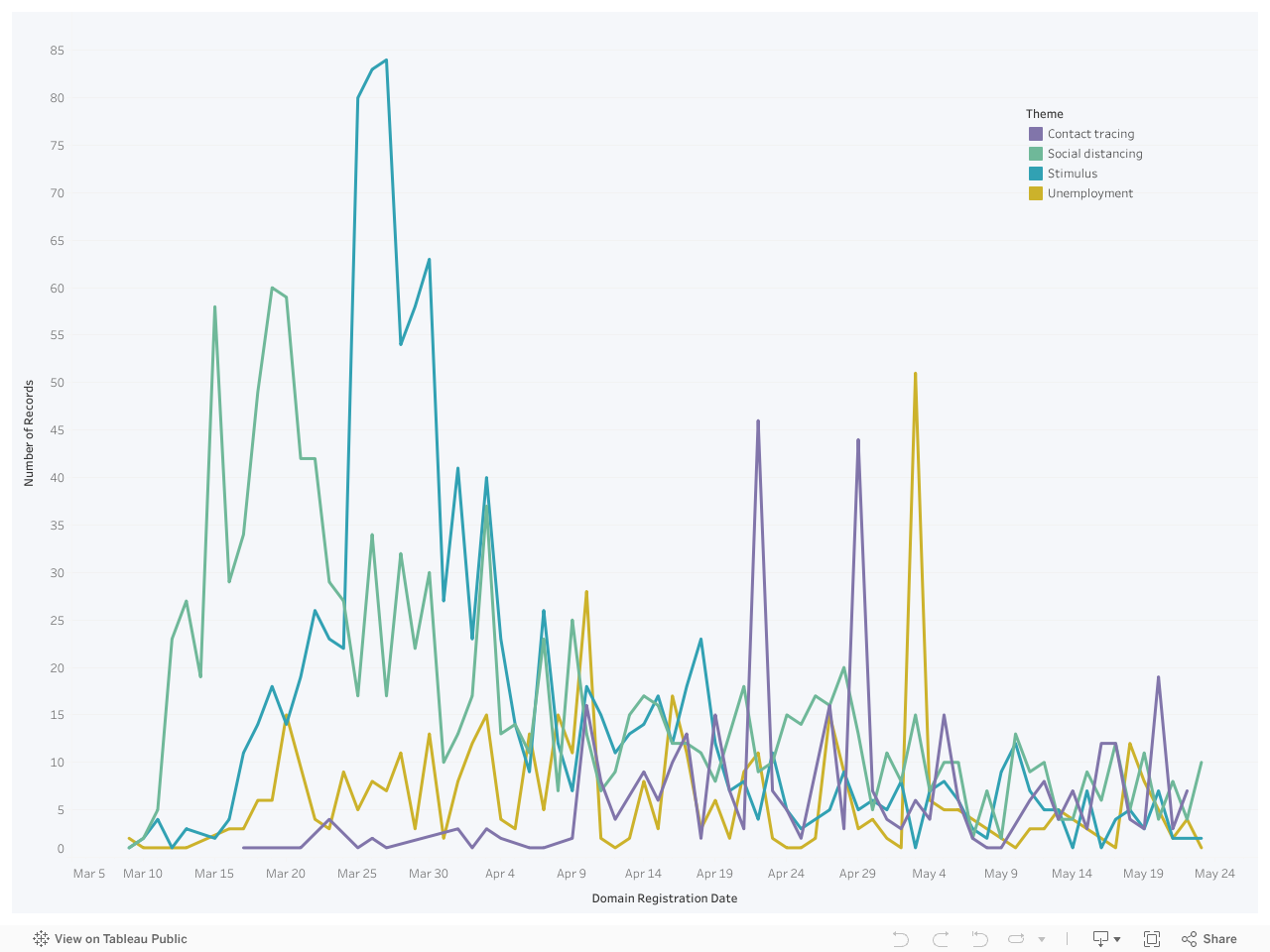 During the first phase of research (late March), we used Certificate Transparency Logs and open datasets to inform our data collection. Our partnership with WhoisXML API provided us with a robust method to actively monitoring domain registrations on a daily basis.
