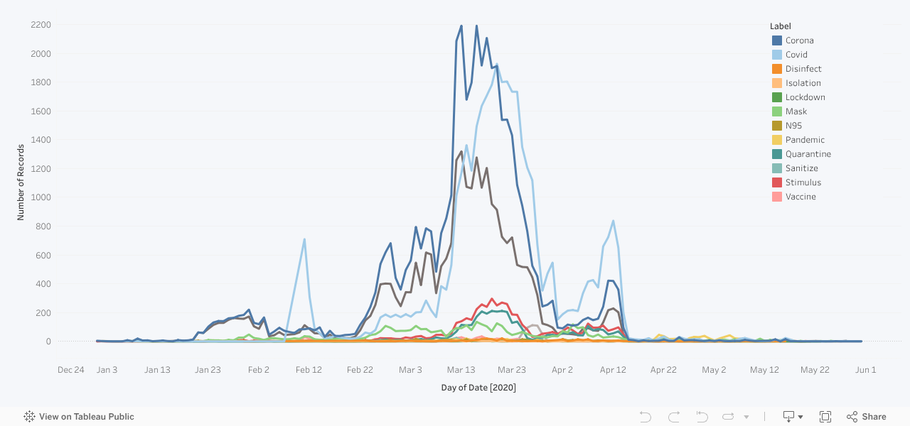 Using natural language segmentation techniques (explained below) we analyzed our corpus of existing data to identify new niches used by bad actors to exploit the pandemic. These were then added to our daily monitoring.