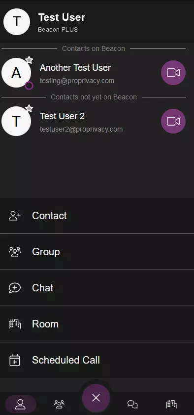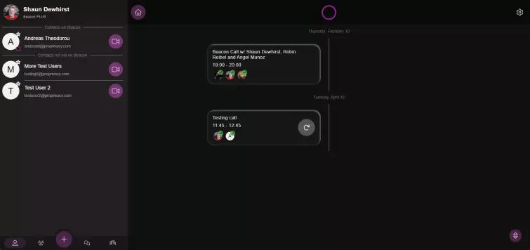The main UI of Beacon is divided into two main parts. There's the left side which displays contacts and contact groups, any rooms you've created and a list of group chats. Hit the big purple plus sign at the bottom of the left pane to bring up the menu to add contacts, etc. The right pane displays all your call activities such as past/upcoming calls.