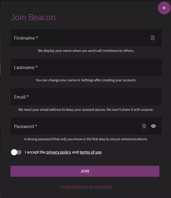 Signing-up for Beacon is a simple process. Point your browser of choice towards Beacon's website and hit the "Join" button. This will bring up the sign-up window and once you've filled everything in, you're straight into Beacon. You don't need to put in your real name, so feel free to use a pen-name or online name instead. Just make sure that you share the name you pick with any folks you're planning to call!
