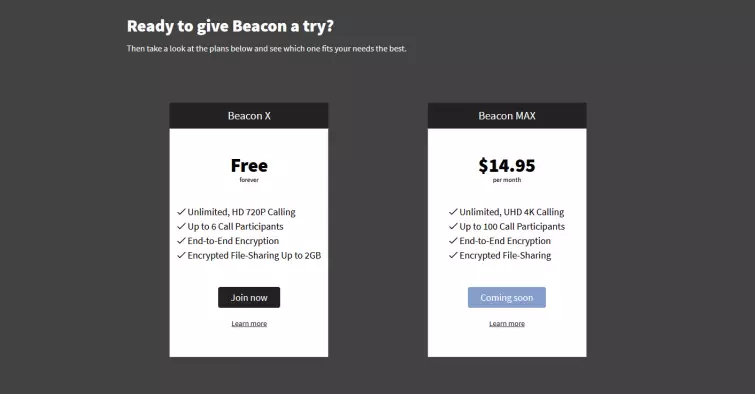 One of the best things about Beacon is that you can try it out for yourself completely free of charge. Beacon X offers video calling for up to 6 people with no limits on the length of the call. The only downside, however, is that you only get 720p streaming, there's no HD/UHD calling.