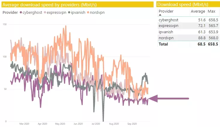 Again, it's not at the top of our list, but CyberGhost VPN's max burst speed result of 658.5 Mbit/s proves that its servers have great capacity, and show that the service competes with the very best VPNs on the market. This means you should have no issues torrenting or streaming in HD with this VPN.