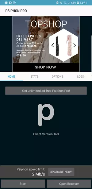 There is also a Psiphon Pro app, which shows even more prominent ads. These can be removed, and the 2 Mbps speed limit increased, for a fee. A “maximum speed” subscription costs £4.99 for a seven-day pass, or £9.99 per month. A “high speed” subscription costs £4.99 per month.