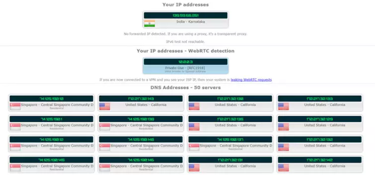 I detected no IP leaks using the Windows app in either SSH or VPN mode, or when using the Android app. Here we can see the VPN test results. Those are Google DNS servers, but the DNS requests are proxied by Psiphon so there is no privacy risk.
