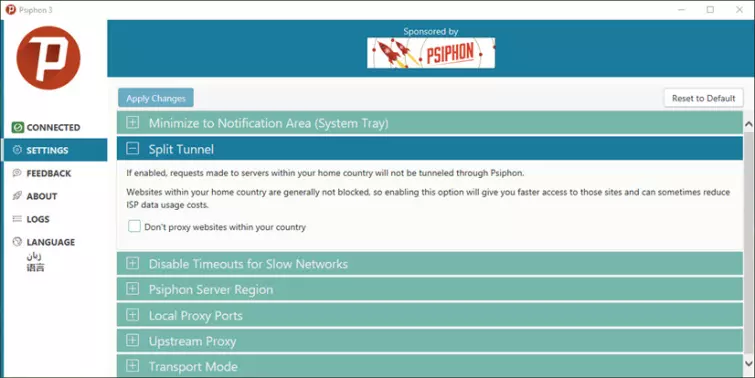 The split tunnelling feature allows you to exempt websites in your country from Psiphon’s encrypted tunnel. This can be handy, as websites are not usually censored inside their own country.
