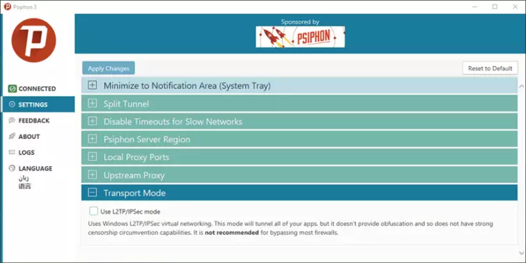 In Windows it is also possible to connect to Psiphon’s servers using the Layer 2 Tunneling Protocol (L2TP)/Internet Protocol Security (IPsec) VPN protocol. This is provided as a backup option, in case SSH connections are blocked. It is not available for mobile users.