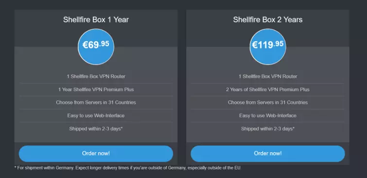 The Shellfire Box costs €69.95 (approx. $75.00), with a one year subscription to Shellfire’s PremiumPlus VPN plan. This works out at a very reasonable $6.25 per month.