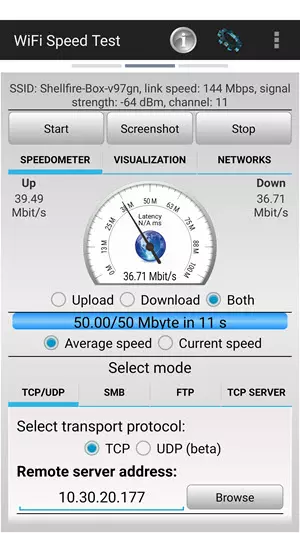 The Shellfire Box uses the 2.4Ghz band with dual MIMO spatial streams. This gives it a theoretical maximum speed of 300 Mbps. I tested local network WiFi performance using the WiFi Speed Test app for Android, with the phone placed next to the routers. Range was about five meters.