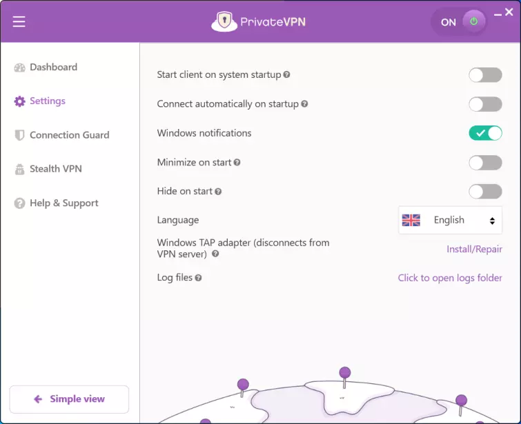 Thankfully, PrivateVPN isn't short on options. You can choose whether your client starts up and connects on Windows boot-up, which will ensure that your connection is covered by PrivateVPN from the moment you log on. You've also got easy access to log files for quick diagnostics and an option to reinstall network drivers.