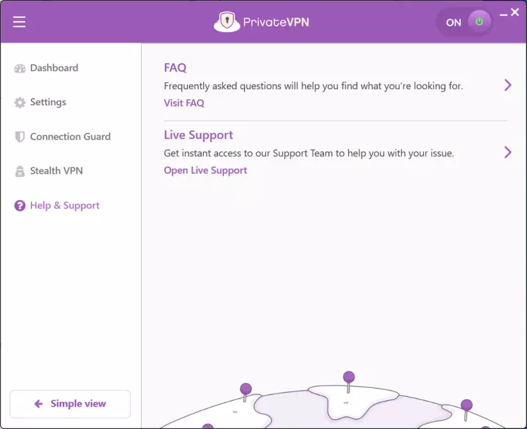 Finally, clicking through to the Help & Support section will give you some useful quick-links to both the FAQ repository on PrivateVPN's website, as well as the Live Support section if you need to find a representative as soon as possible to solve an issue.