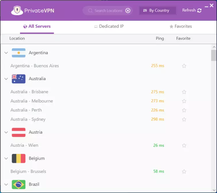 Once you open up the location picker, PrivateVPN gives you a range of locations to choose from in an easy-pick menu. If you need help choosing, there's a ping readout which refreshes in real time and gives you an idea of what your latency will be like. You can also pick favorites if you need to bookmark a server for easy access.