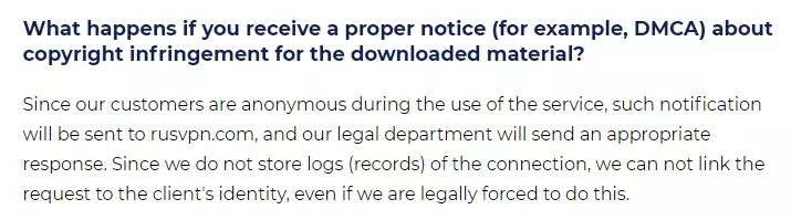 The no-logs nature of the policy is reiterated in the DMCA notices section: