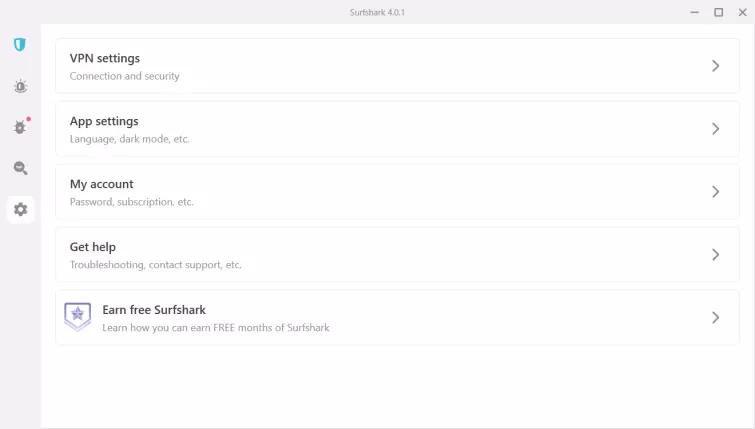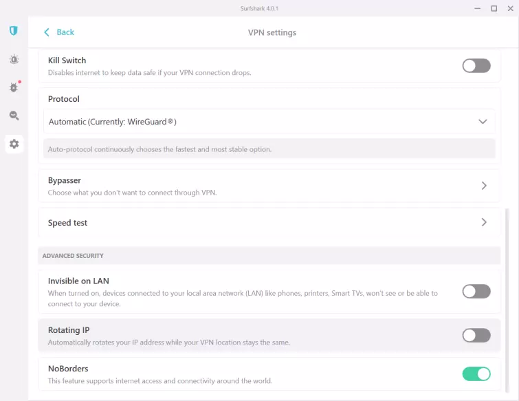 Accessing VPN configuration options is easy, through a sidebar you always have access to from the Surfshark dashboard. Most of the configuration options are self-explanatory, but most of these options do not need to be touched in order to get the most out of Surfshark.