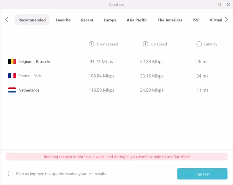 Surfshark also offers an in-app speed test which allows you to either choose from a pre-populated list or create a list of your favorite servers, and then run a quick Speed Test on them to give you accurate and up-to-date information on which server is right for you. It might be that you're prioritizing latency while you're playing an online game or taking a voice call, or you might need maximum download for that hefty 4k video you're streaming. Whatever your use case, Surfshark's Speed Test gives you current connection information with absolutely no technical skills needed whatsoever, and all in an easy-to-read layout.