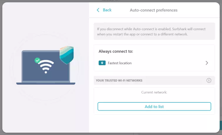 The Auto-connect options menu is simple to navigate, presenting you with the Wi-Fi network you're connected to and an interface that allows you to add new networks to your trusted list on the fly, as well as a configuration for connection preference. Most users won't need to change this from Fastest Location, but again, it's nice to see that Surfshark is offering this level of customization.