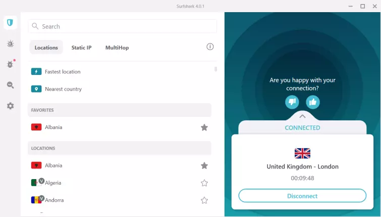 The Surfshark interface itself is clean and minimalistic, striking a balance between white and grey backgrounds and the deep sea colors of Surfshark's house style. This makes it very easy to spot the feature you're looking for without much effort. All of your connection details are hidden under a quick-access pop-up tab, and it's easy to connect to a new server either by picking Fastest location or Nearest country to get started automatically. If you've got a particular need to connect from a certain country, a search bar gives you quick access to the servers you need.